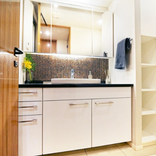 ▲寬廣的洗手台,三面鏡、多個櫥櫃提供收納空間。